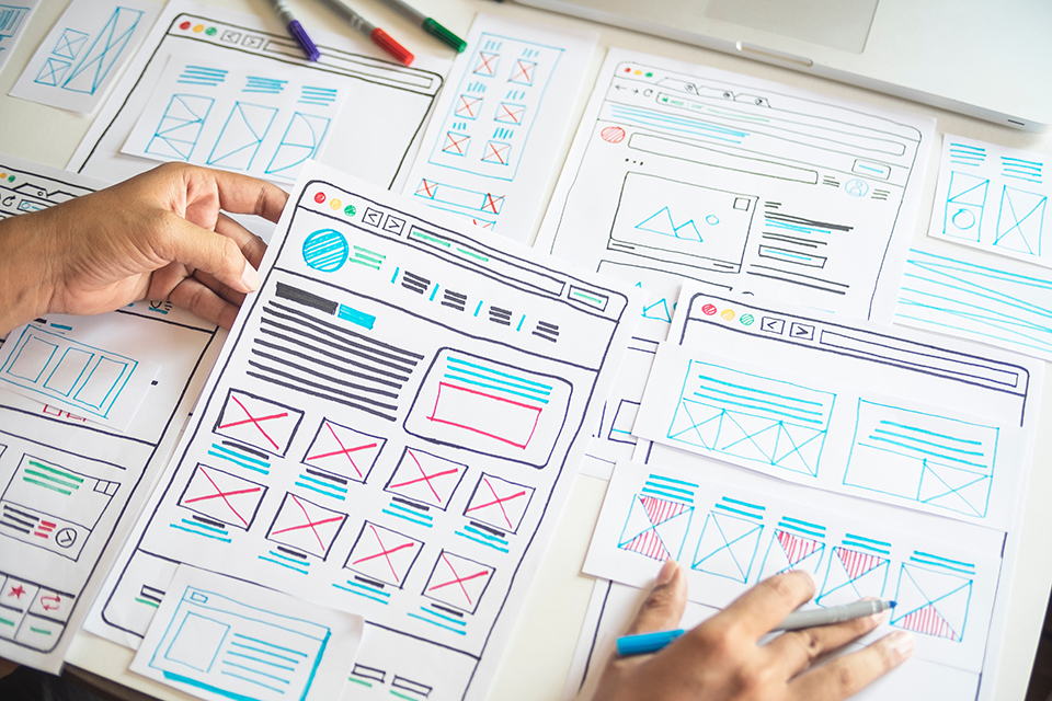 「04 要件定義」の内容についてお客様のご確認を頂いたのち、レイアウト・デザインを固めていきます。サイトのデザイン制作では、要件定義書で作成した「ユーザーのストーリーボード」をもとに、各ページ内及びサイト内の導線をまず固めます。その後、ニュースサイト・ポータルサイトが扱う情報の中身を起点に、お客様がサイトのユーザーに訴求したいイメージについてヒアリングさせて頂きながら、デザインを制作します。