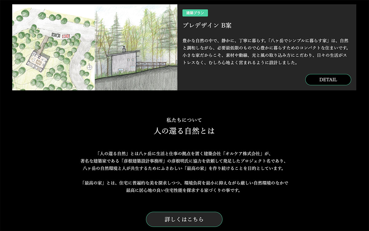 Webサイトではこのコンセプトの部分をどのように訴求していくか、デザインと構成の両面から検討を重ねました。地方への移住や別荘の購入を検討されている方のみならず、多くの方にとっても、「住宅建築」に対する新しい視点を得るきっかけになるかもしれません。