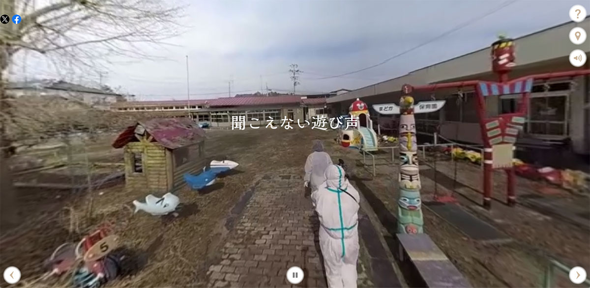 当コンテンツは、福島第一原発事故により帰還困難区域となった双葉町で、園児のいないまま「時が止まった保育園」を取材し、その様子を360°VRリポートとして制作したものです。当時の期間困難地域では厳密な入域制限が行われており、防護服を着用し線量計を携行して取材・撮影を行いました。