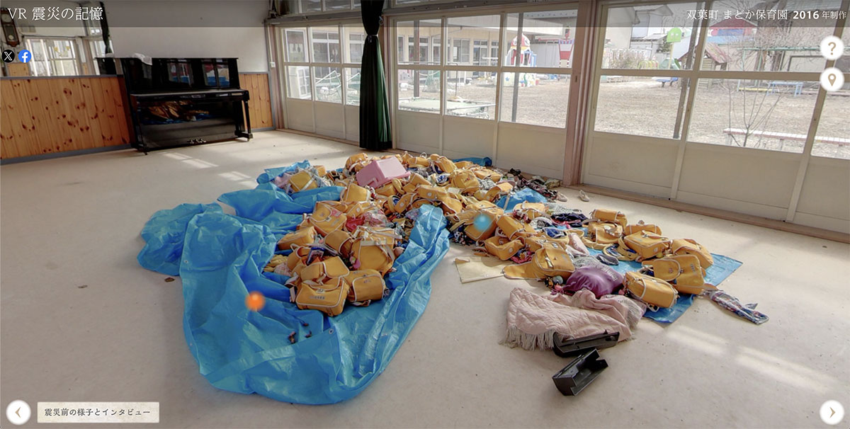 取材に同行して頂いた副園長先生と共に、震災当時の様子を振り返りながら、「時が止まったままの保育園」を見てまわります。360°VR画像とVR動画を混在させたコンテンツ構成となっており、360°VR空間内の各所に解説コメントやインタビュー音声を設置しています。