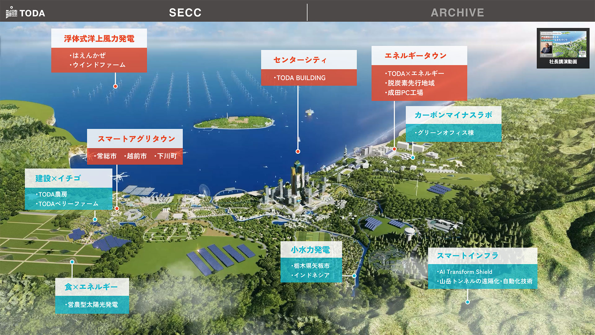 特設サイトでは、戸田建設様が構想する未来都市構想「SECC(Smart Energy Complex City)」をテーマに、同社の技術や取り組みをご紹介するコンテンツのほか、CEATECでの講演内容、各種の資料などが掲載されています。